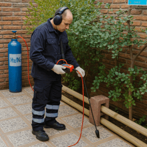 Servicio no invasivo para localizar con precisión fugas de gas natural/GLP en redes domiciliarias o de edificio. Empleamos metodologías instrumentales —principalmente gas trazador 5% H₂ / 95% N₂ con detector electrónico (sniffer) mezcla no inflamable y segura , permitiendo ubicar el punto probable de fuga sin romper innecesariamente.